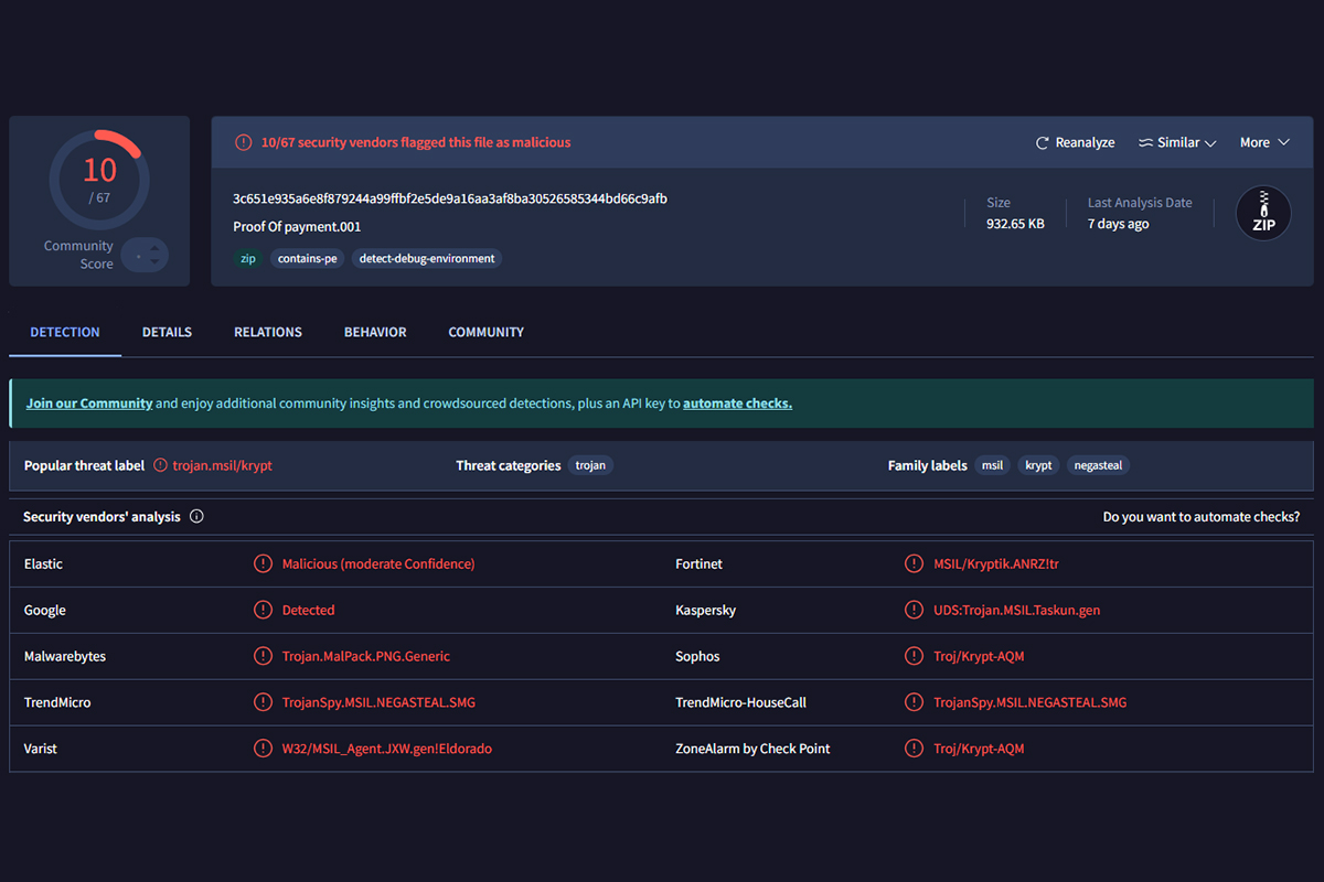 According to VirusTotal , the malware likely belongs to the Krypt or Kryptik Trojan family. Besides malicious email attachments, Trojan infections can also occur by downloading and executing files from untrusted and unsafe websites. They can perform malicious activities on infected systems without the target’s knowledge, such as creating backdoors, establishing remote connections with command and control (C2) servers, maintaining persistence, and dropping other malware. Some can also target and capture keyboard input, such as account credentials, financial information, and other sensitive data.