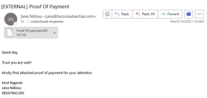 The NJCCIC observed a malware campaign sent to New Jersey State employees, purporting to be proof of payment. The malicious emails contain a ZIP file labeled “Proof Of payment.001” with a SHA-256 hash. The ZIP file appears legitimate but includes a Microsoft EXE file labeled “u1ugeglmfc8xvoc” that drops several files, including a PowerShell script.