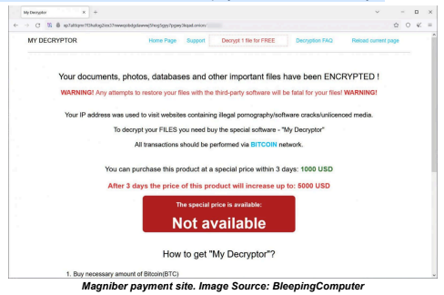 Researchers reported a global spike in Magniber ransomware attacks targeting home users. Since July 20, one website received almost 720 submissions from infected users. Magniber was first discovered in 2017 and is believed to be a successor to Cerber ransomware. Users infected with this variant will have a random five to nine-character extension appended to encrypted files. Victims will find a ransom note named READ_ME.htm instructing them to download the Tor Browser to reach the Magniber ransom site. As this campaign targets home users, the ransom payment initially has been set at $1,000 but will increase to $5,000 if the threat actors do not receive the Bitcoin payment within three days.